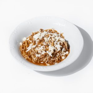 Спагетти альденте подаются с митболами на основе мраморной говядины и мяса козленка под со...