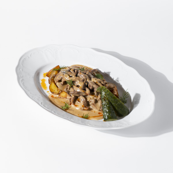 Состав:говядина глазной мускул,лук репчатый,Соус бешамель,бульон куриный,масло чесночное,грибы вешенки,пюре картофельное,зелень,малосольные огурцы.