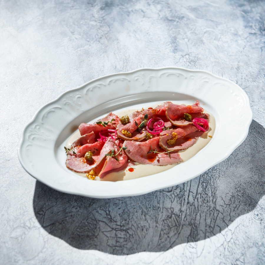 Ростбиф из фермерской говядины подаётся с маринованным красным луком и устричным домашним майонезом.