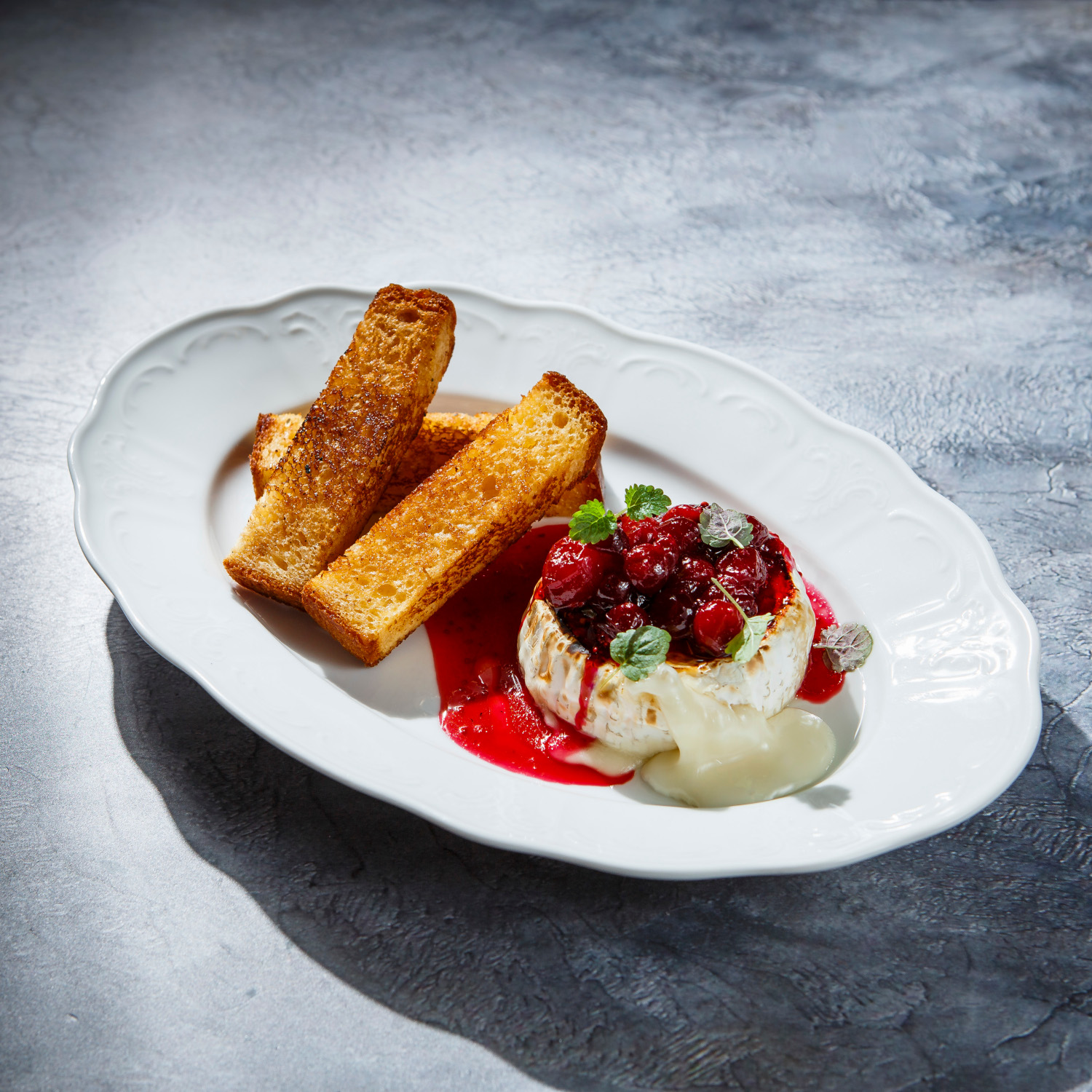 Запечённый фермерский сыр камамбер, дополненный вареньем из лесной дикорастущей клюквы в бурбоне. Подаётся с хрустящей бриошью.