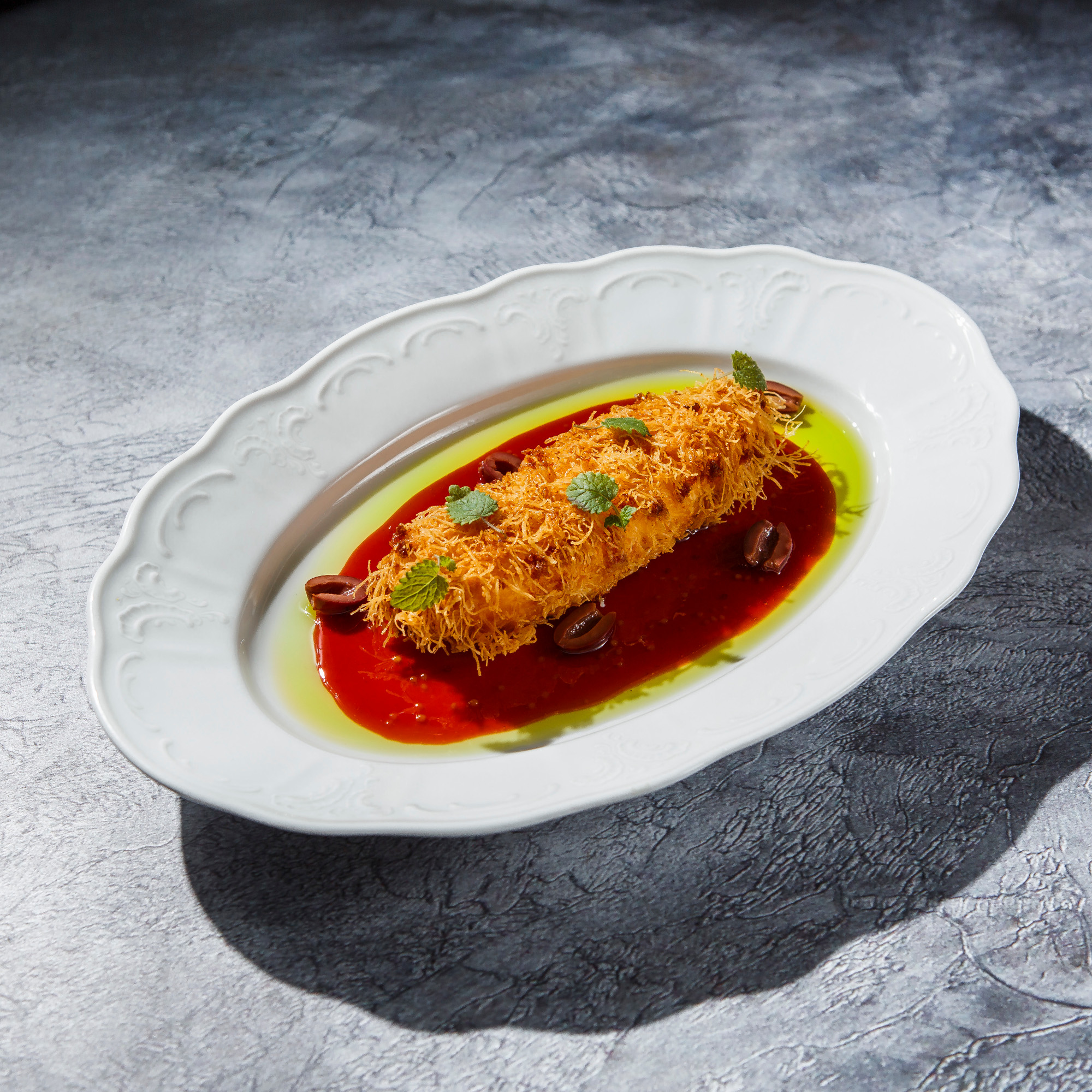 Состав: сыр брынза, тесто, соус малиново-медовый, яйцо куриное, масло оливковое, соль морская, специи, микрозелень.