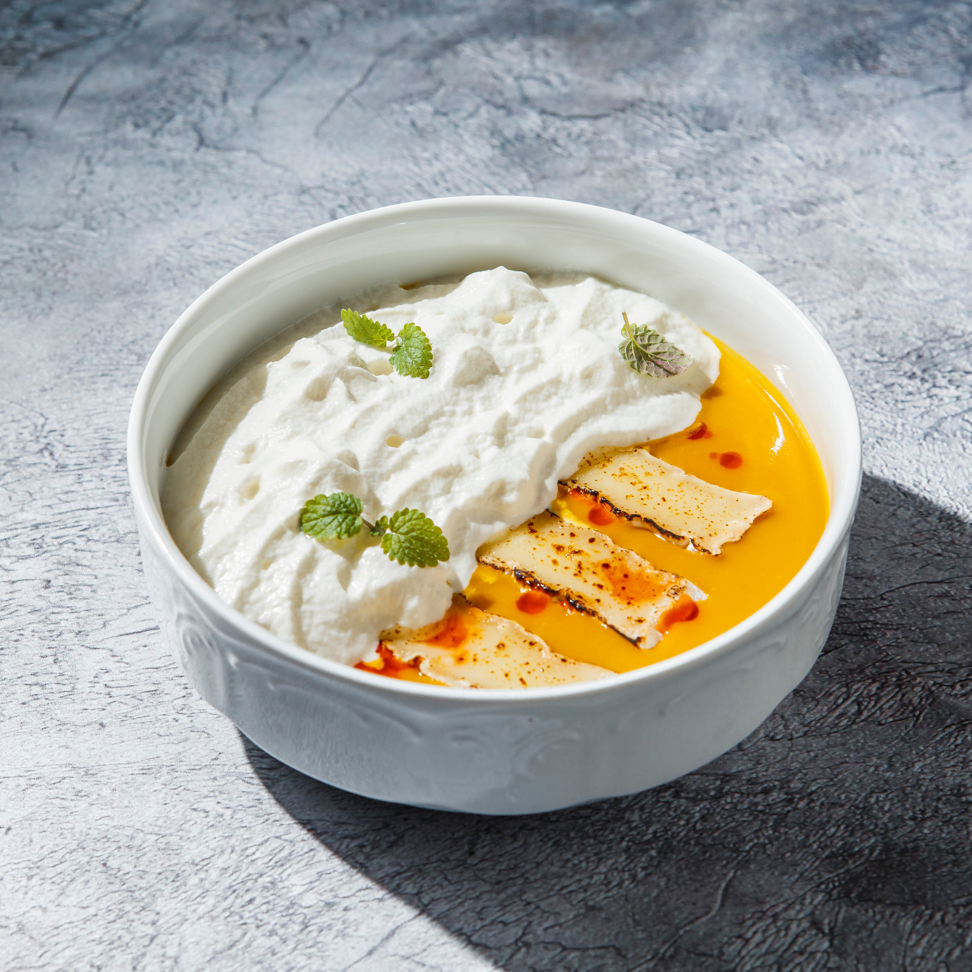 Крем-суп из тыквы на овощном бульоне, кокосовом молоке и сливках, с нашим фермерским сыром камамбер. Цитрусовая нота лемонграсса во вкусе.