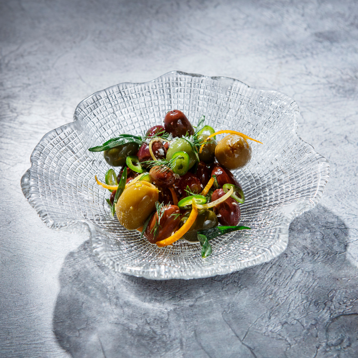 Оливки четырёх разных сортов, замаринованные в оливковом масле с добавлением цитрусов, перца и чеснока, обладают плотной, сочной мякотью и насыщенным маслянистым вкусом. Хороши в качестве закуски сами по себе, разнообразят вкус привычных салатов и брускетт и подойдут для подачи в закусочных тарелках.