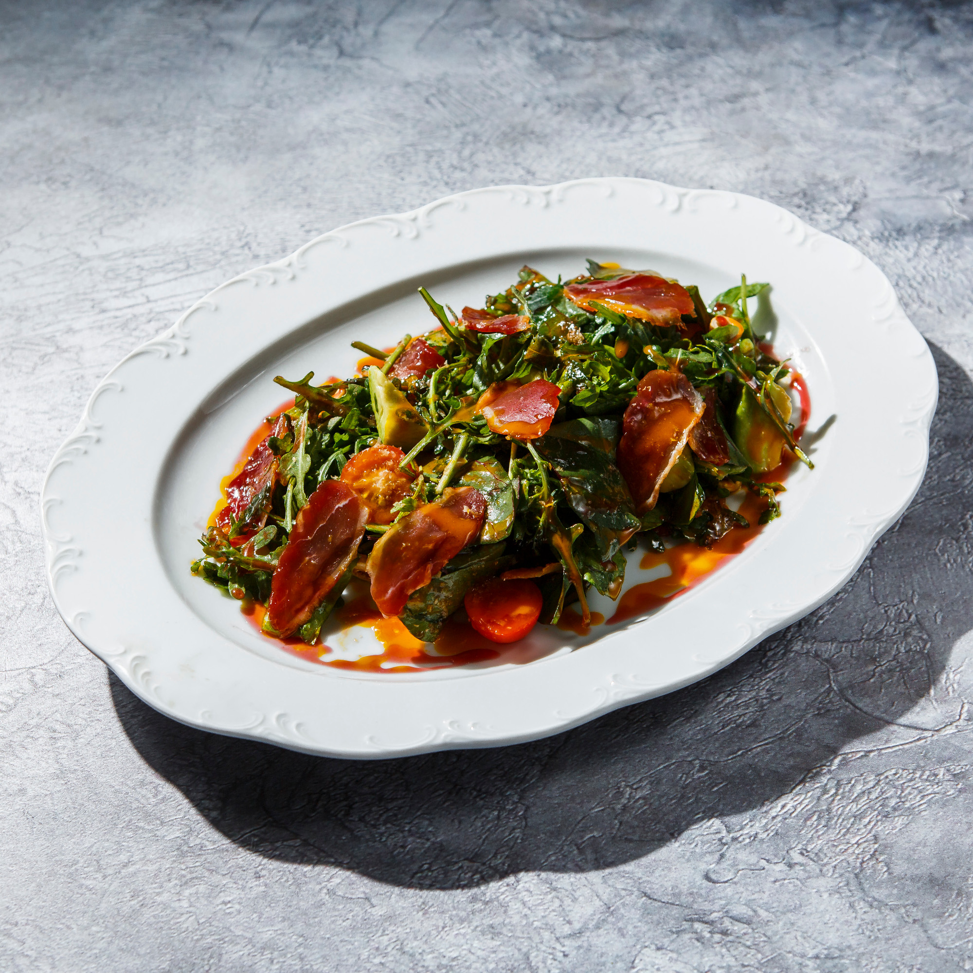 Смесь салатных листьев с сырокопчёным филе утиной грудки, сыром камамбер, авокадо, томатами черри и тёртым орехом макадамия. Облепиховый и малиновый соусы.