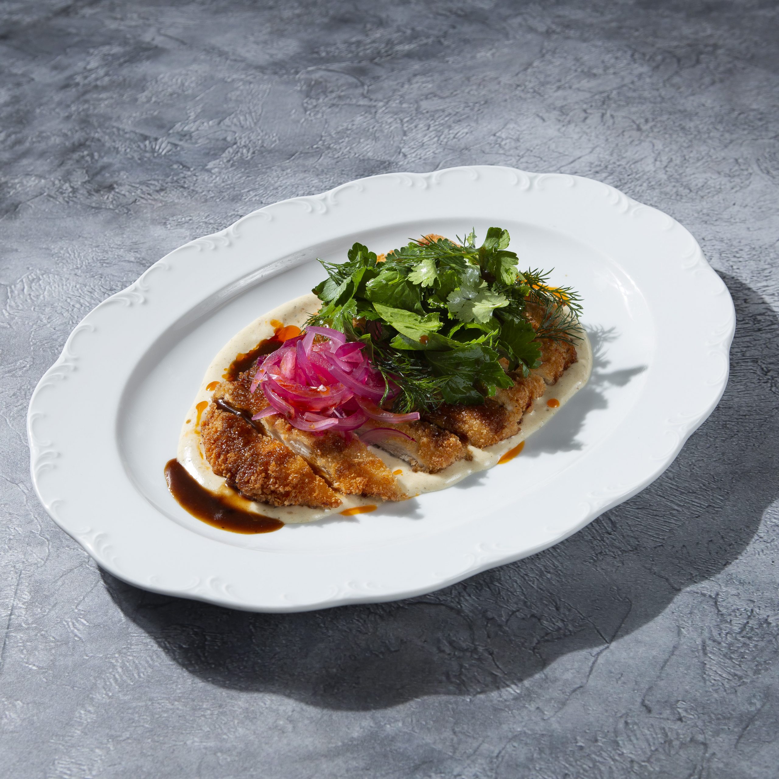 Куриный шницель в хрустящей панировке подаётся с рыбным соусом на основе шпрот, сливок и каперсов с миксом из зелени. Дополнительно украшается красным мариновынным луком, подчёркивающем вкус блюда.