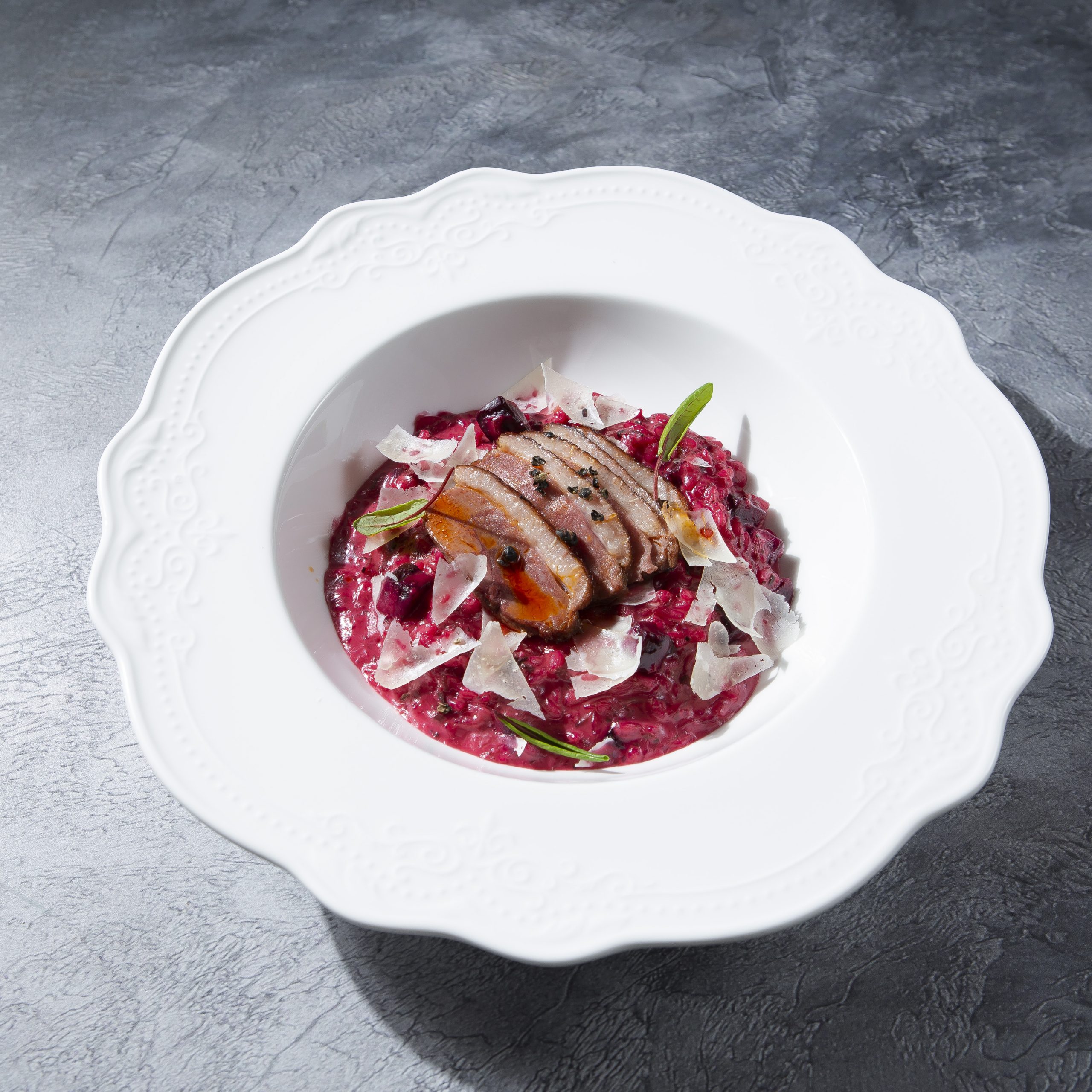 Свекольное ризотто с маринованным утиным филе