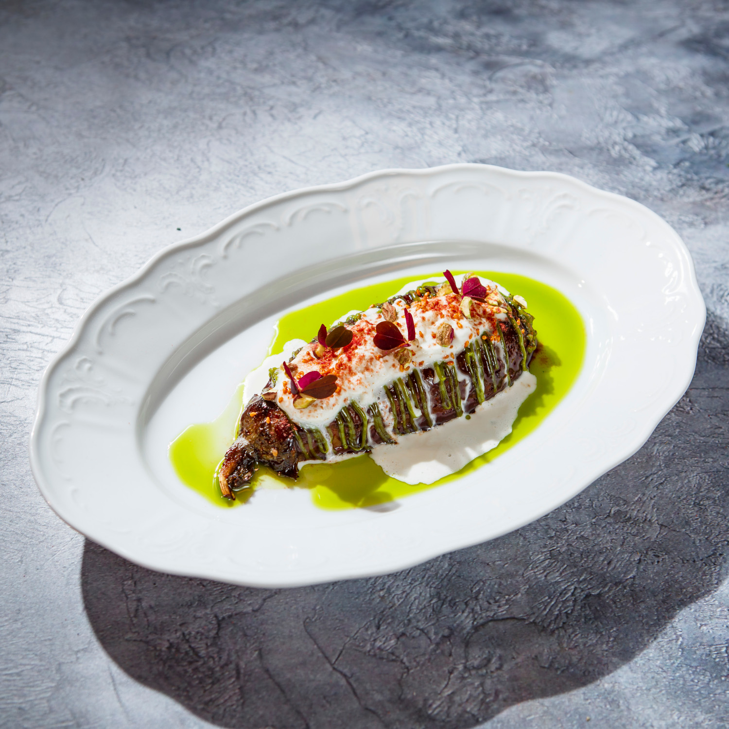 Состав: баклажан, сыр страчателла, соус хойсин, соус терияки, соус наршараб, яйцо куриное, масло растительное, горчица, лайм, зелень, сливки, соль морская, фисташки, кунжут, микрозелень, малина сублимированная.